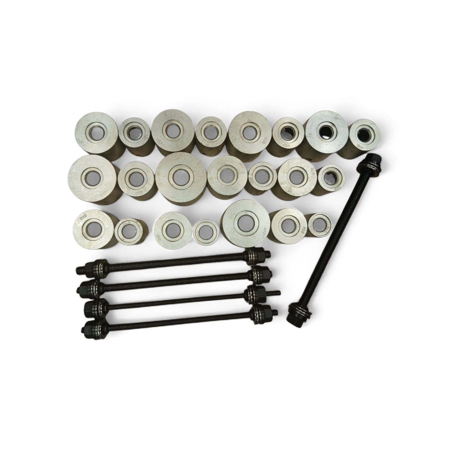 Profesionāls presēšanas komplekts, paredzēts riteņu gultņu, rumbu, buksu un blīvju uzstādīšanai un noņemšanai bez demontāžas no automašīnas. Piemērots lielākajai daļai vieglo automobiļu un vieglo komercauto.