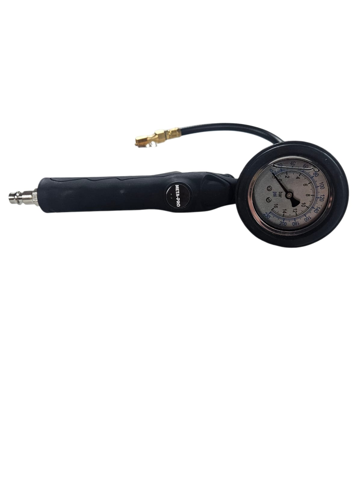 Komplektā ir rokas pistole ar integrētu spiediena mērītāju un elastīgu šļūteni ar ātro savienojumu, paredzēta riepu piepumpēšanai un spiediena kontrolei.