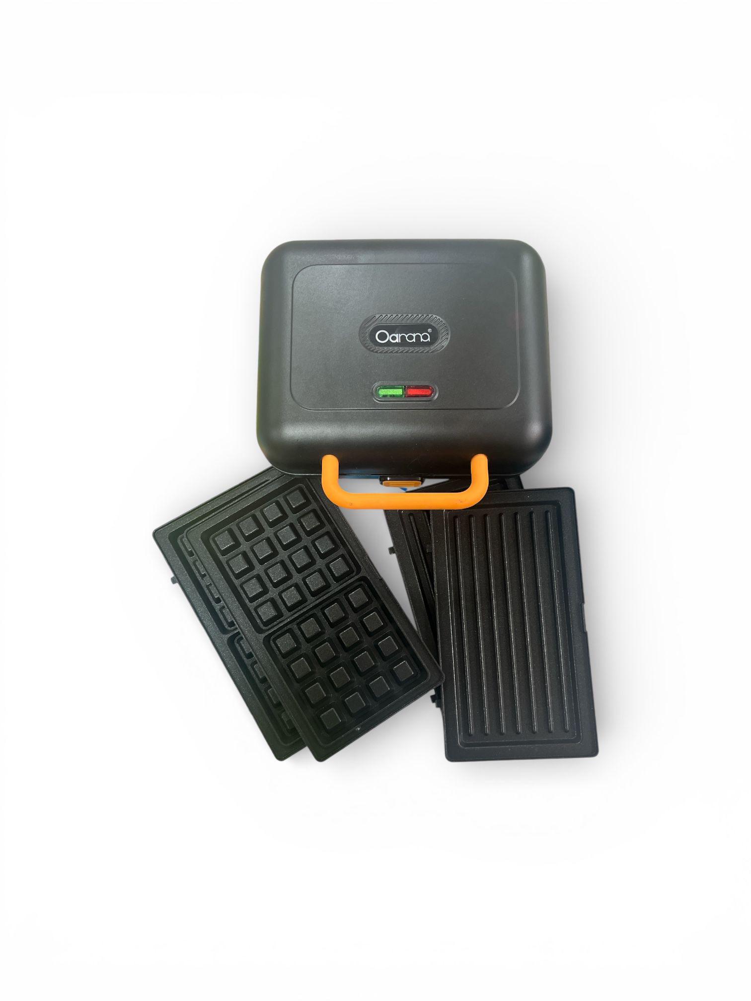 Praktisks un daudzfunkcionāls OARANA 3-in-1 virtuves aparāts, kas ļauj ātri un ērti pagatavot kraukšķīgus sendvičus, gardas vafeles vai grilēt gaļu un dārzeņus.